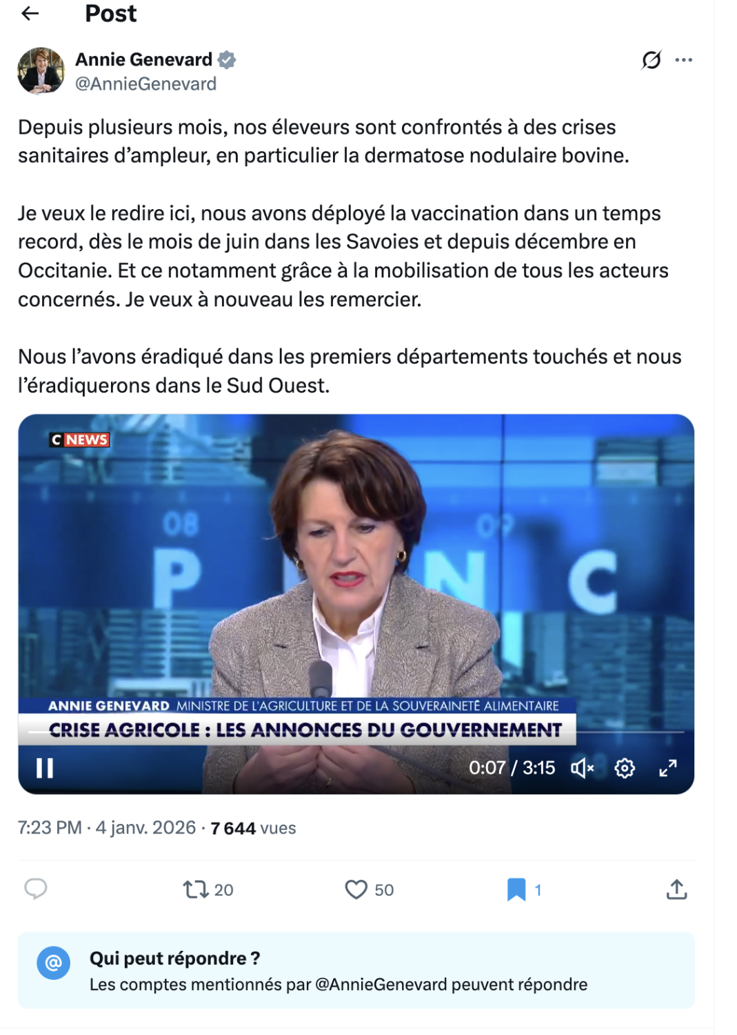 Le 4 janvier, alors que la tension agricole atteint un niveau critique à la veille d’une mobilisation nationale d’ampleur, Annie Genevard, ministre de l’Agriculture et de la Souveraineté alimentaire, a pris la parole sur le réseau X à l’occasion de son passage sur CNews. Un message censé démontrer l’action et l’écoute du gouvernement, mais qui…