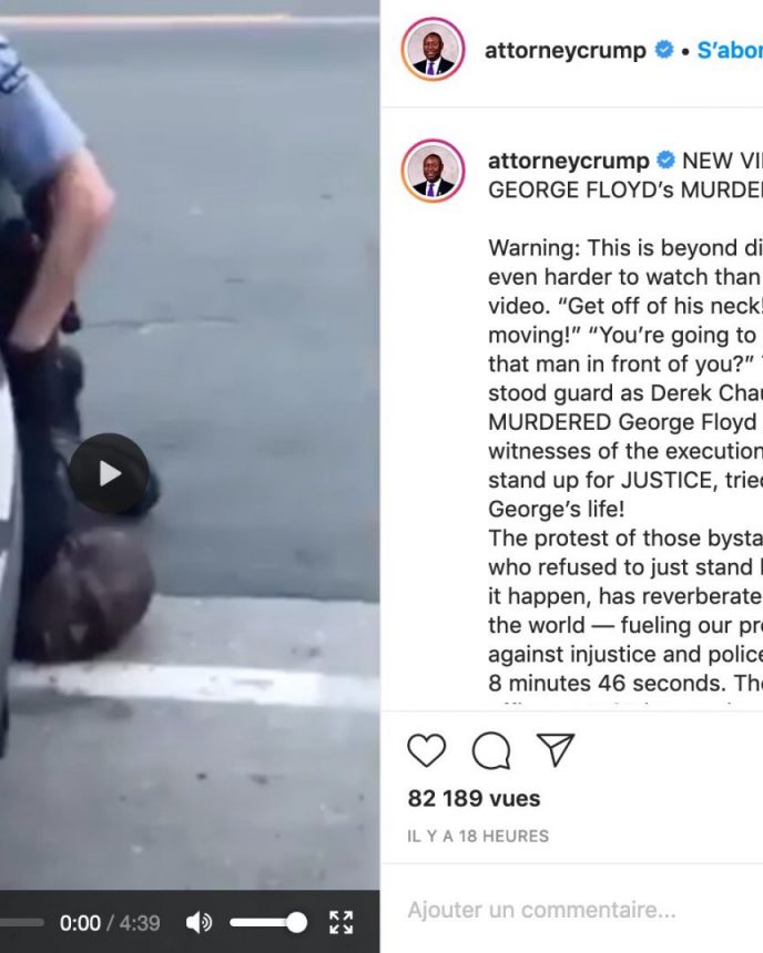 Société (Vidéo choc) Mort de George Floyd: une nouvelle vidéo dévoilée par l’avocat de la famille Floyd Ce dimanche 14 juin, c’est une nouvelle vidéo de l’arrestation de George Floyd par la police de Minneapolis qui a été rendue publique sur le compte instagram de Ben Crump l’avocat qui représente la famille Floyd. La mort de George Floyd lors d’une arrestation a mis en émoi de nombreux pays où des manifestations se […]