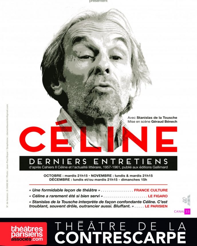 Stanislas de la Tousche : « Céline, je peux dire que je l’ai dans les nerfs ! » Stanislas de la Tousche ne joue pas Céline. Il l’incarne, se fond au personnage jusqu’à nous mettre en présence du sulfureux auteur qui fait toujours polémique près de 60 ans après sa disparition. Acteur hors-pair, Célinien avéré, de la Tousche nous entraîne dans les méandres de l’œuvre, de l’homme, des deux (dé)mêlées… Et il parvient à étonner les plus réticents comme ce fut le cas au festival d’Avignon où il a fait le plein à chaque représentation. D’où vient donc cet interprète qui pousse le talent jusqu’à ressembler à Louis-Ferdinand…