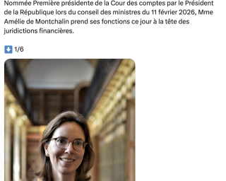 Société Cour des comptes : Amélie de Montchalin, juge et partie, ... Il fallait oser. Et l’exécutif a osé. Le 11 février 2026, en Conseil des ministres, Emmanuel Macron a nommé Amélie de Montchalin Première présidente de la Cour des comptes. Prise de fonctions le 23 février. Elle succède à Pierre Moscovici, parti siéger à la Cour [...]
